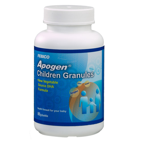 Apogen este un supliment alimentar care susține dezvoltarea imunității copiilor și ajută în protejarea organismului de virușii gripali (de tip A, B și H1N1), intestinali, herpetici, virusul dengue, respiratori (RSV sau VSR) și rotavirus. De asemenea, este potrivit și pentru buna dezvoltare și funcționare a creierului și a ochilor. Apogen este un produs care a primit numele de superaliment, deoarece este obținut din microalga FEM-101, o alga albastră verzuie, foarte bogată în nutrienți, proteina din microalge fiind patentată în SUA și Taiwan.